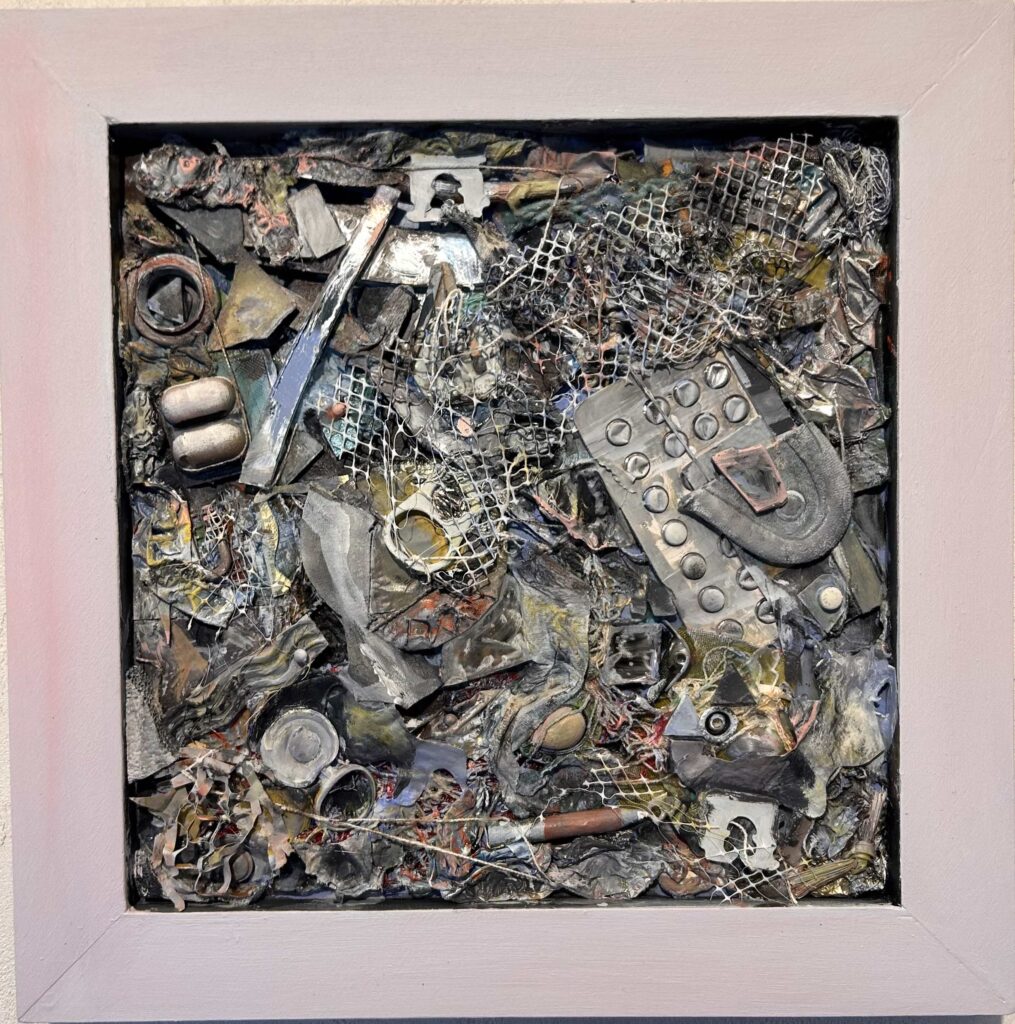 Materials: Crumpled exam glove, plastic earring, birth control packet, clementine bag, broken mirror, fabric sample, canvas string, contact lens packaging, olive oil bottle insert, pencil stub, chocolate foil wrapper, shipping label, bread clips, empty Dayquil pack, cut up credit card, lit matches, bubble wrap, plastic pull tab, thumb tack, cat food can lid, glass from shattered windshield, plastic action figure hand, part of baby bib, auto shop towels, sewing pins, superglue, acrylic paint, and nail polish on cradled birchwood panel.