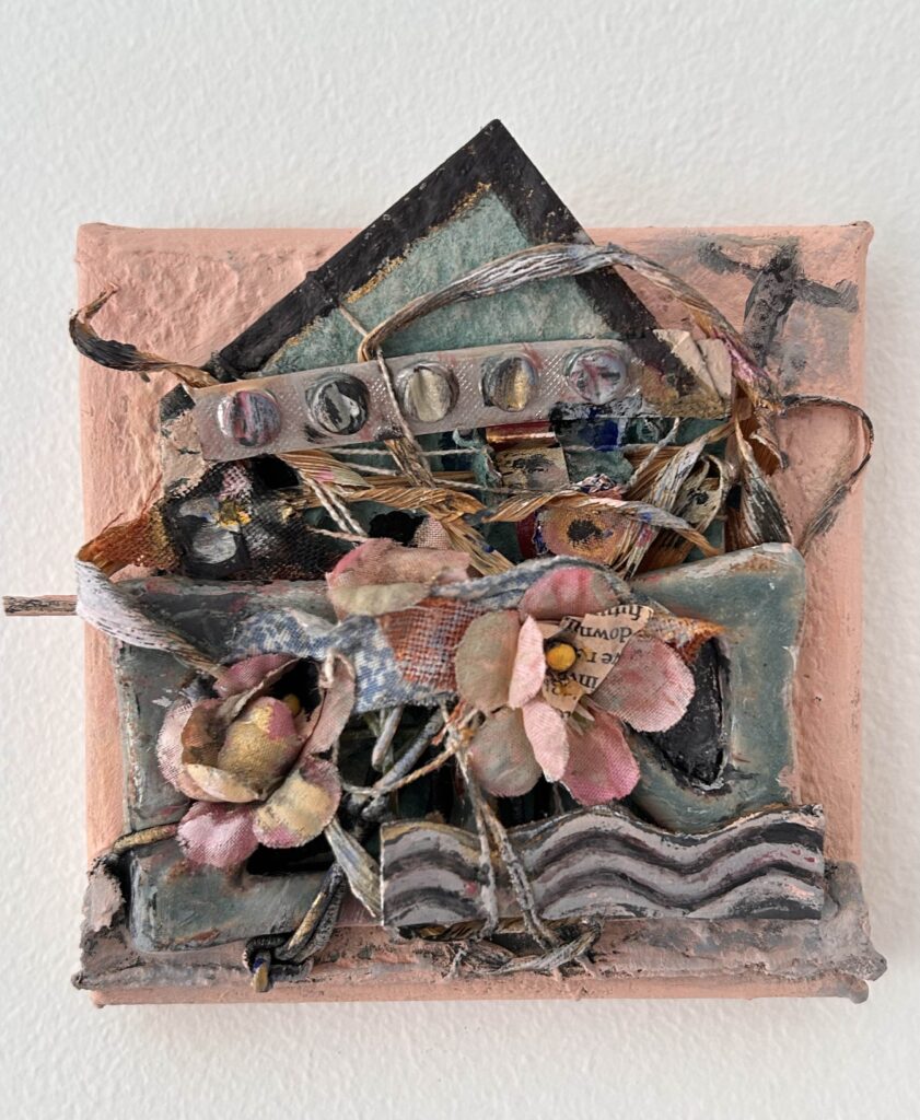 Materials: Sardine tin, sewing-kit contents, birth control pills, Paxlovid blister pack, clementine bag, broken mirror, woman’s face is from plastic wrap of Trader Joes paper towels